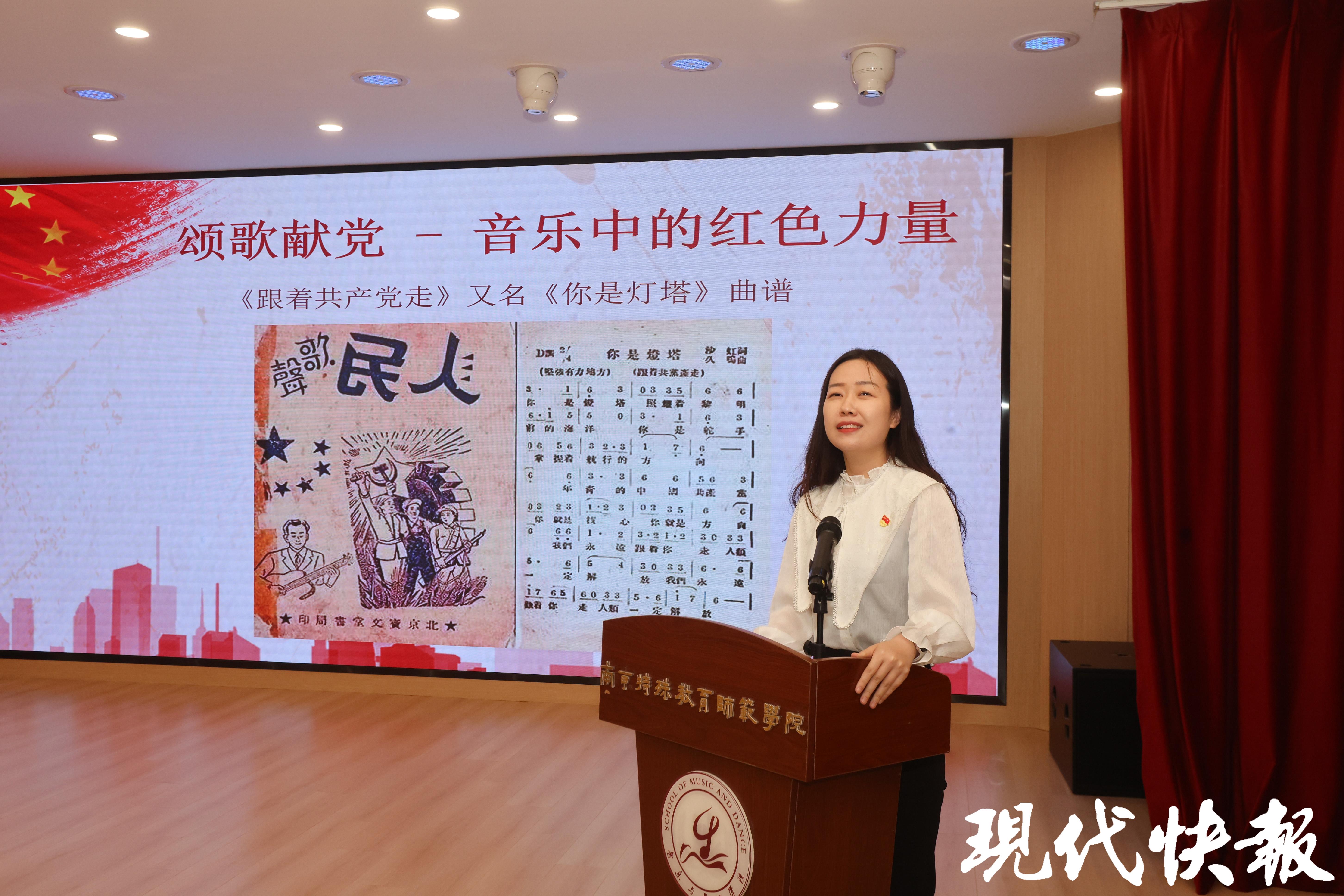 “你是灯塔,照耀着黎明前的海洋;你是舵手,掌握着航行的方向。伟大的中国共产党,你就是核心,你就是方向……”一曲红色经典旋律在南京特殊教育师范学院音乐厅响起。音乐与舞蹈学院教师党支部书记张敏讷带着全体学员们深情演唱《跟着共产党走》,并带着大家一起重温了这首歌曲的创作背景,沿着抗日战争时期革命先驱的足迹,回顾中国共产党的光辉历程。