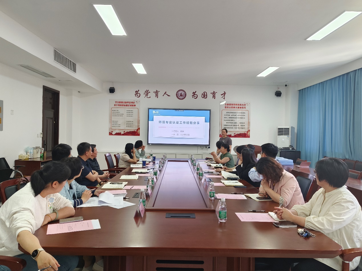 陈琳副院长从专业认证工作回顾、经验总结分析以及后续工作目标三个部分讲述了专业认证工作体会。李鹏副书记聚焦师范专业认证工作中学生工作部分,着重强调学生发展的定位和作用,分享了学生工作在师范专业认证过程中的实践经验。何燕春副院长分享关于实地考察的心得体会,她以专业技能为核心,围绕考察路线和模拟实验教学两个主线,详细介绍了在实现人才培养质量目标、师范专业能力培养目标以及师范专业认证合格目标中实践教学环节的重要作用。