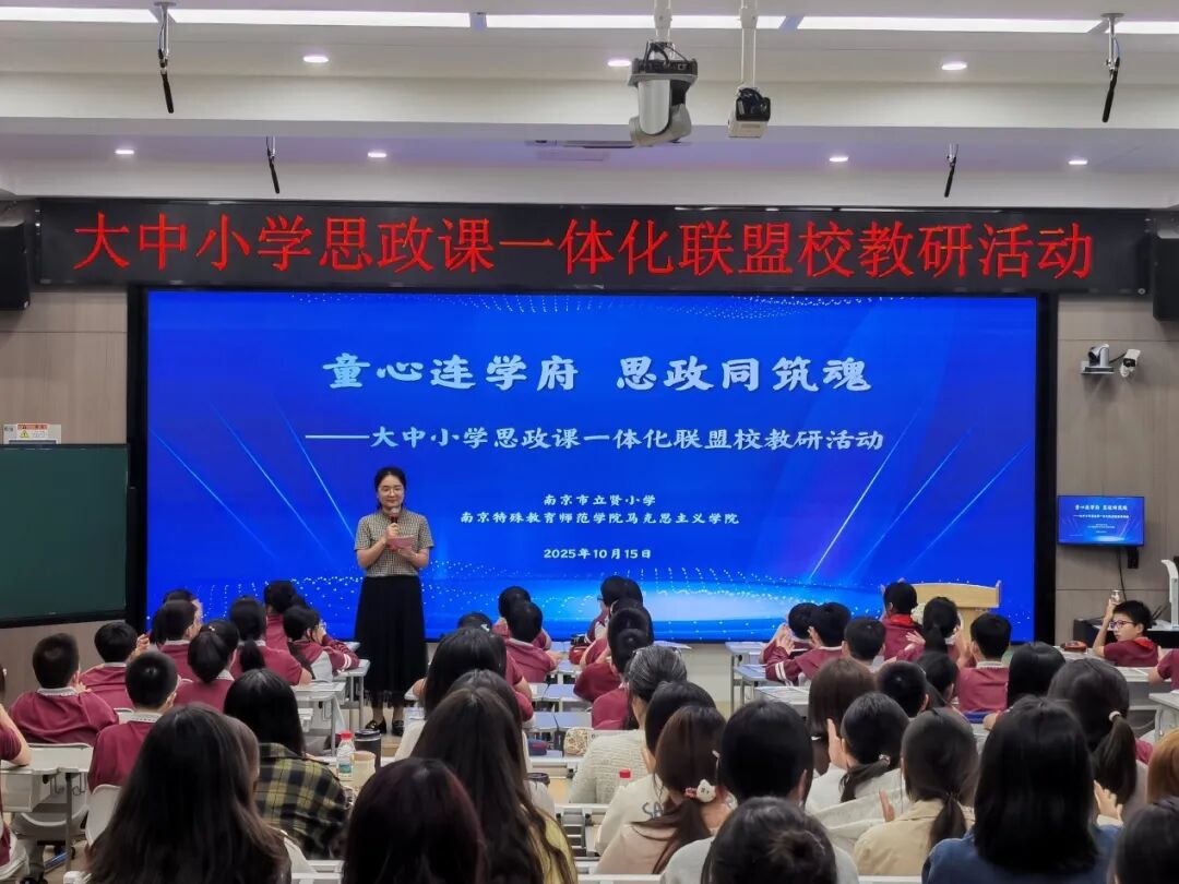 2025年10月15日,马克思主义学院与南京市立贤小学联合开展大中小学思政课一体化联盟校教研活动。本次教研活动在立贤小学录播教室举行,马院师生代表与小学思政教师齐聚一堂,围绕思政教育一体化建设展开深入研讨与实践交流。