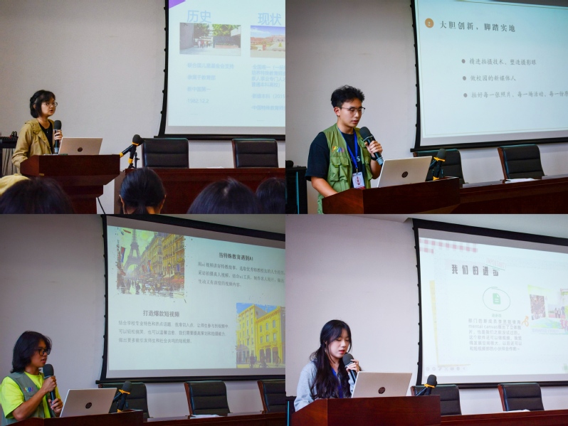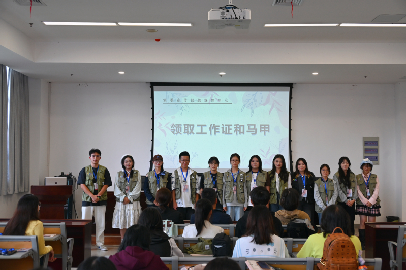 活动在各部门负责人的总结汇报中拉开序幕,各负责人以清晰的数据、生动的案例,对上一学期的工作进行了总结、对未来发展做了展望,充分展现了各个部门的工作风貌和创新活力。在新闻报道方面,融媒体中心及时准确地传达了学校的重要活动和师生的优秀事迹;在形式创新上,通过新颖的内容和互动,吸引了大量师生的关注。为欢迎新加入的小伙伴们,各负责人为新生代表佩戴工作证,穿上工作马甲。