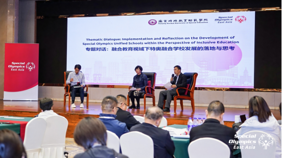 在主题分享环节,行业专家与一线实践者轮番登场,带来了极具参考价值的经验分享。特奥东亚区组织发展部副总裁曹忆菊以全局视角,全面梳理特奥全球融合学校计划的发展脉络,从国际实践层面为参会者搭建了宏观认知框架。美国西北大学教育与社会政策学院副教授尹路通过在美国实施的特奥融合示范学校与学生学业及行为表现的关系研究分享了最新数据成果。我校体育学院主持工作副院长金梅立足本校特教特色,分享了学校在融合课程开发、特色活动设计中的创新探索。蒙古国特奥融合学校甘努尔学校教师、韩国特奥融合学校吾信高中教师则结合各自地区的文化背景与教育实际,介绍了融合学校建设中的本土化经验,展现了不同地区在课程设计、活动开展、家校协同等方面的多元创新做法,为跨区域经验互鉴提供了丰富素材。