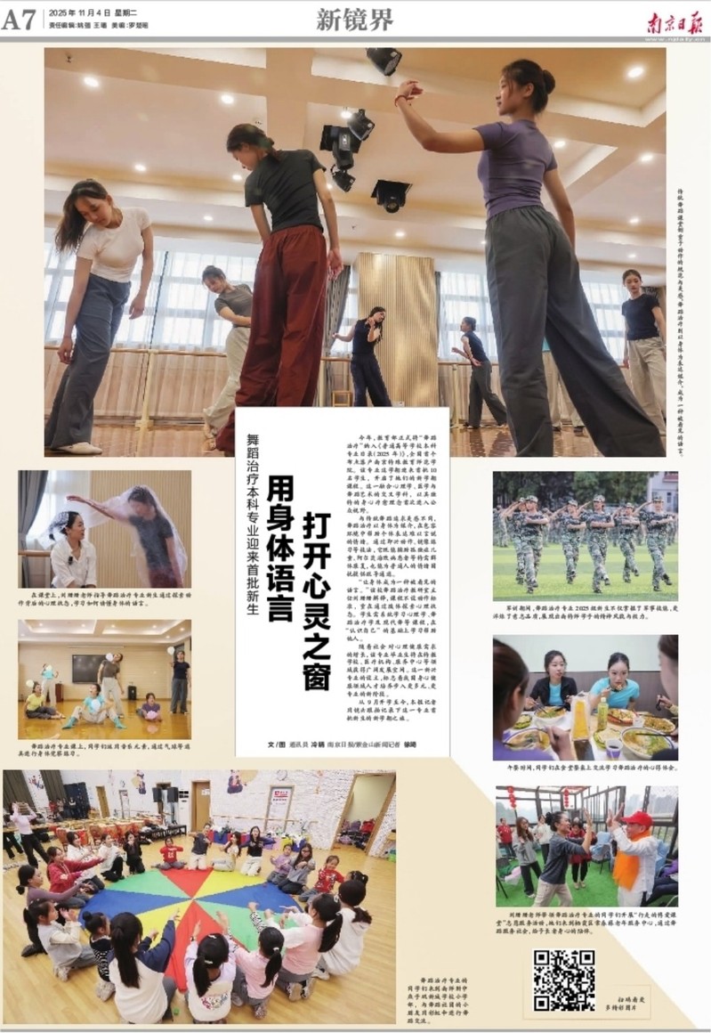 今年,教育部正式将“舞蹈治疗”纳入《普通高等学校本科专业目录(2025年)》,全国首个布点落户南京特殊教育师范学院。该专业这学期迎来首批10名学生,开启了她们的新学期课程。这一融合心理学、医学与舞蹈艺术的交叉学科,以其独特的身心疗愈理念首次进入公众视野。