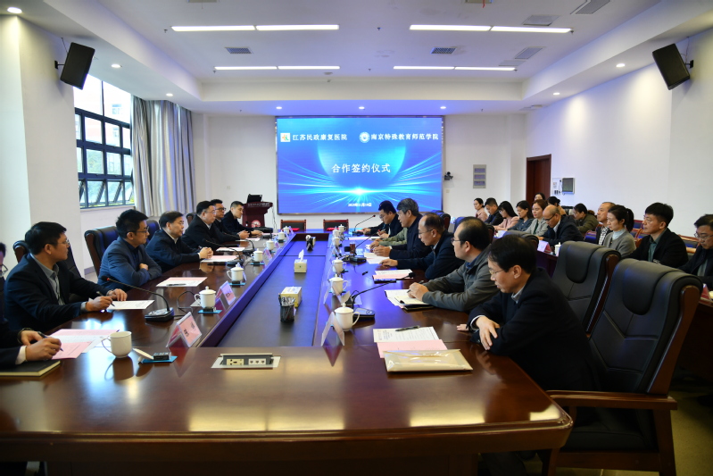 2025年11月10日下午,南京特殊教育师范学院与江苏民政康复医院(江苏中大民康医院)合作组建“南京特殊教育师范学院附属江苏中大民康医院”签约仪式在我校实验实训大楼201会议室举行。校党委书记黄军伟、副校长张茂林、相关职能部门负责人、康复科学学院领导班子成员,江苏民政康复医院(江苏中大民康医院)的领导和专家代表共同出席签约仪式。