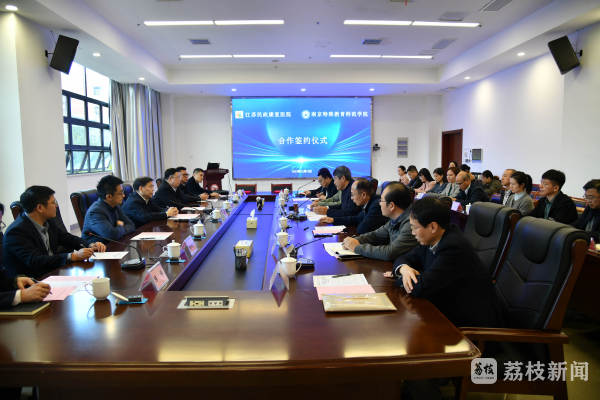 仪式前,江苏省民政厅党组书记、厅长谢晓军,党组成员、副厅长秦海涛一行在校领导陪同下,参观了校园及“剪韵西游”孙洪香剪纸系列作品巡展,对学校的办学特色与校园文化建设给予高度评价,并现场见证了签约仪式。