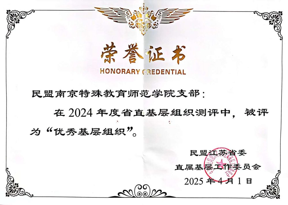 民盟江苏省委直属工作委员会对省直基层组织2024年度工作进行全面测评,经过严格评审,民盟南京特殊教育师范学院支部凭借其年度出色的工作成效,获评“优秀基层组织”荣誉称号。