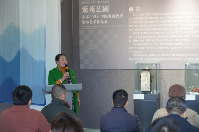 正高级工艺美术师、江苏省陶瓷艺术名人、学院客座教授陈红梅作为艺术家代表发言。她结合自身从艺与教学的双重经历,分享了紫砂创作中“师古”与“育新”的感悟。她认为,紫砂的“匠心”本质与教育所需的“爱心”“耐心”天然契合,每一件作品背后,都是技艺的传递与情感的融合。