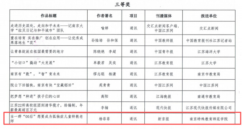 日前,由省新闻工作者协会指导、省教育新闻工作者协会主办的“2024年度江苏教育好新闻”评选结果公布。我校报送的通讯作品《当一群“00后”想要成为孤独症儿童特教老师》荣获三等奖。