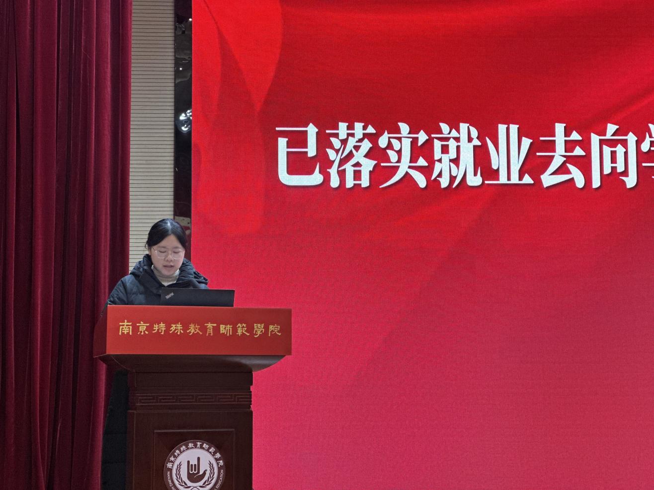 已落实就业去向的学生代表童夏轩进行发言。她结合自身成功签约的经历,从信息收集、能力准备与心态调整三个方面分享了求职心得。她建议同学们积极拓展信息渠道,提前梳理并充实个人实践成果,以自信从容的姿态主动争取机会。鼓励在场同学早做准备、大胆尝试,以稳健的心态迎接职业生涯的挑战。