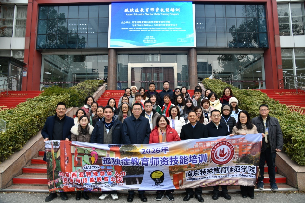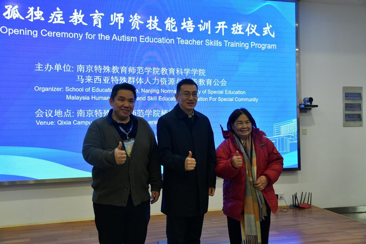 为深化“一带一路”教育合作,促进中外特殊教育理念与实践的互鉴共享,1月4日上午,由南京特殊教育师范学院教育科学学院与马来西亚特殊群体人力资源与技能教育公会联合举办的孤独症儿童教师教育技能培训班,在南京特师栖霞校区正式启动。南京特师党委常委、副校长吴彬江,马来西亚特殊群体人力资源与技能教育公会会长陈奕夫及双方代表共同出席了开班仪式。