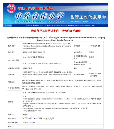 南京特殊教育师范学院长期深耕特殊教育与康复领域,其数学与应用数学专业为江苏省一流本科专业、数据科学与大数据技术专业入选江苏省卓越工程师教育计划2.0,在相关学科建设、师资队伍与教学科研方面积累了深厚基础;合作方匈牙利佩奇大学作为匈牙利历史悠久的知名高等学府,在康复医学、计算机科学等领域拥有鲜明教学特色,其欧盟特殊教育和数智康复专业认证体系更是成熟完备。双方基于“优势互补、资源共享”原则,历经多轮沟通对接,于2025年5月就合作办学模式、专业设置、人才培养方案等核心内容达成共识,在匈牙利出口促进局南京创新中心协助下顺利完成申报流程。