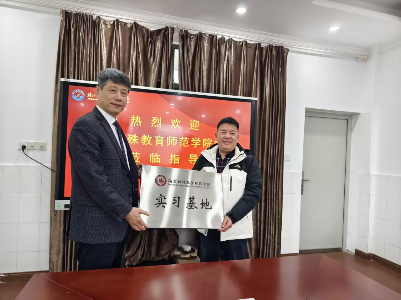 在靖江市特殊教育学校,党支部书记、校长赵红钦介绍了靖江特校“以生为本、融合发展”的办学理念与实践成效,他表示近年来多位教师在省市教学比赛中斩获佳绩,基本功比赛、优课评比、课题研究等成果在泰州特教领域始终名列前茅,这些成绩的取得离不开大量南特校友的贡献,目前这些南特校友已成为学校发展的中坚力量。黄书记代表南京特师向靖江特校授牌,并希望双方在人才培养、科学研究、社会培训等方面持续深化合作,携手推动特殊教育高质量发展。