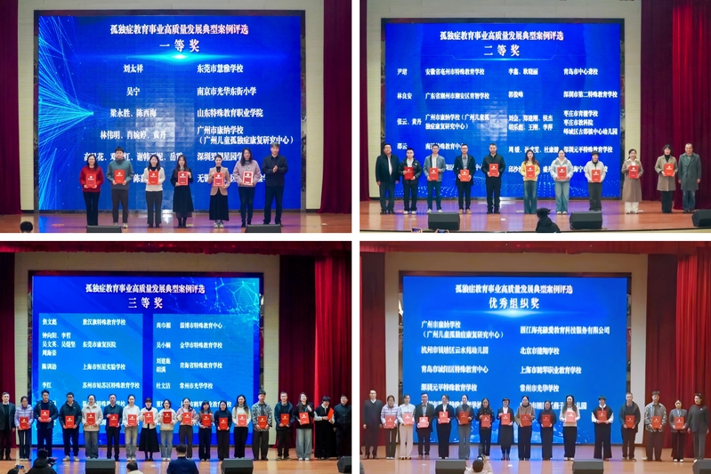 开幕式上,举行了孤独症教育事业高质量发展典型案例评选颁奖仪式。本次评选共收到172家单位的439份案例,经严格评审选出40个优秀案例,其中一等奖6个、二等奖10个、三等奖24个,同时表彰20个优秀组织单位,这些获奖案例为孤独症教育实践提供了可复制、可推广的宝贵经验。南京特殊教育师范学院党委书记、中国孤独症儿童教育康复联盟理事长黄军伟,华东师范大学融合教育研究院院长邓猛教授、南京特殊教育师范学院特聘教授徐云等为获奖个人和单位颁奖。