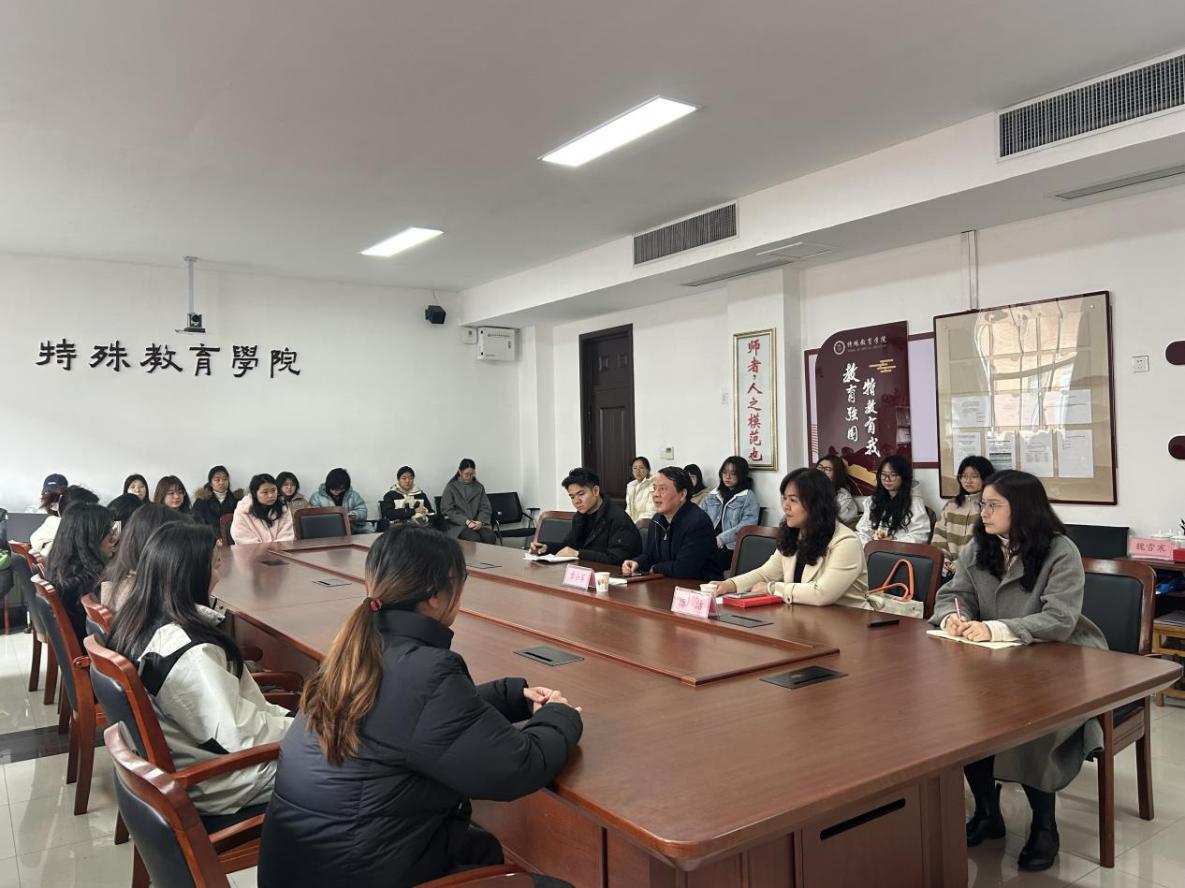 在分享会前的座谈中,章小军同志对陈洁书记和系主任魏雪寒一行的到来表示热烈欢迎,何燕春副院长专题介绍了特殊教育学院的发展历程、师资力量以及在专业建设、课程建设、教学科研和社会服务方面取得的成效,并陪同参观了学院实验室建设情况。双方围绕专业人才培养方案的调整、实习基地的建设、社会服务的拓展等议题展开深入交流。(文、图/吴娴雅 李黄睿 解晶 编辑/尚海艳 宋宁宁 审核/章小军 冷晴)