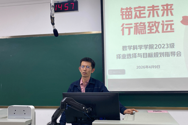 大三学年是职业规划从蓝图走向实践、就业准备从认知迈向行动的关键转折期。为进一步推进学院学风建设,扎实做好学生成长发展指导工作,帮助同学们科学合理规划学业与职业路径,提前做好升学与就业各项准备,4月9日下午,数学科学学院召开2023级学生择业选择与目标规划指导会,会议由辅导员朱思橙主讲,学院党总支副书记谢军和2023级全体学生参会。
