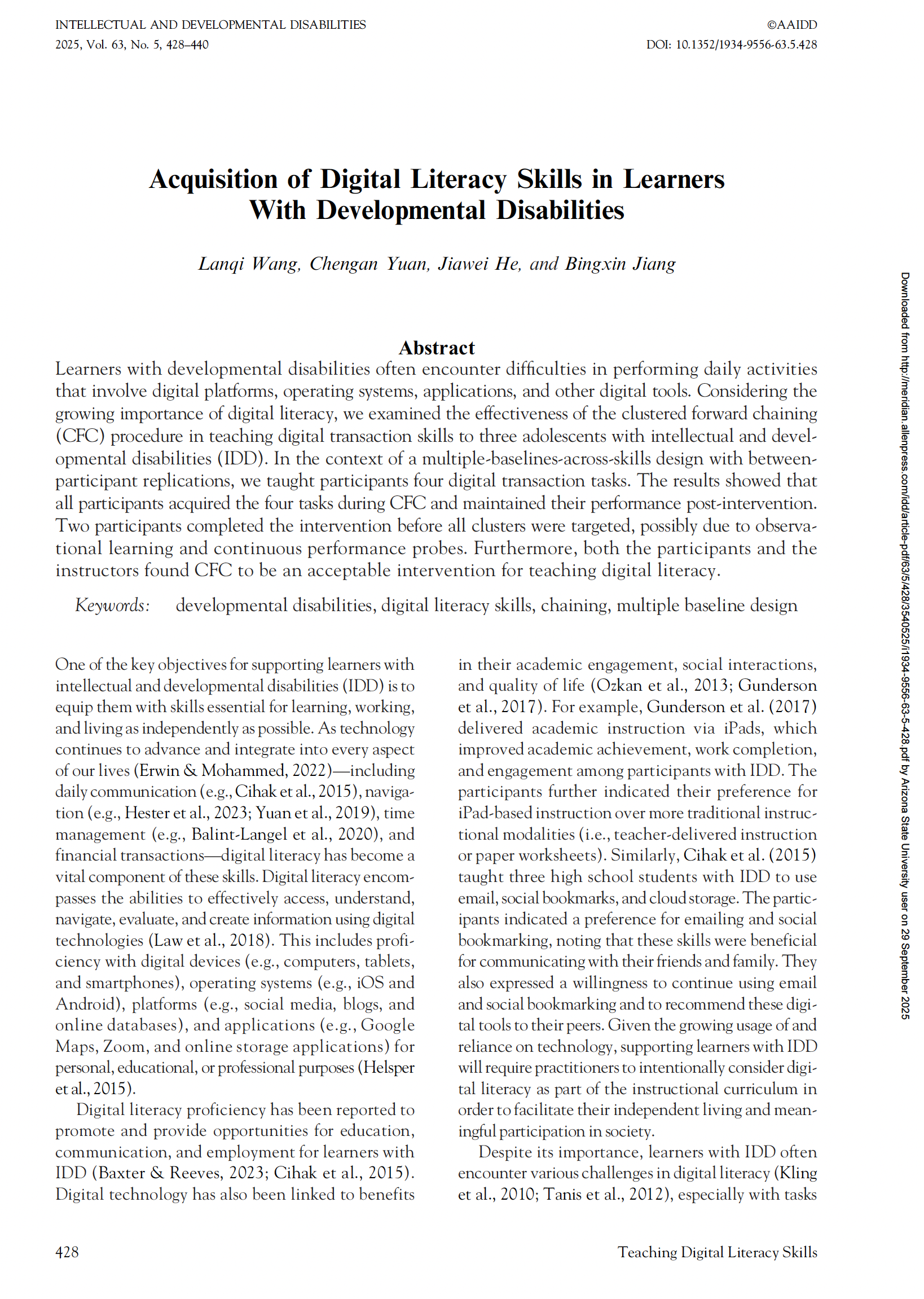 论文题为《Acquisition of Digital Literacy Skills in Learners with Developmental Disabilities》,聚焦于发展性障碍学生数字素养的获得与提升,探讨在数字化社会背景下,如何通过有效的教学设计和支持策略,帮助学生掌握使用智能设备、移动应用和网络平台等基本数字技能。研究结果显示,系统性的数字技能教学不仅能够显著提高学生在数字环境中的操作能力与任务完成度,也有助于增强他们在学习和生活中的自信与独立性。该研究为特殊教育领域数字素养教学的实施提供了新的思路与实证依据,对推动信息化背景下的融合教育发展具有重要启示意义。
