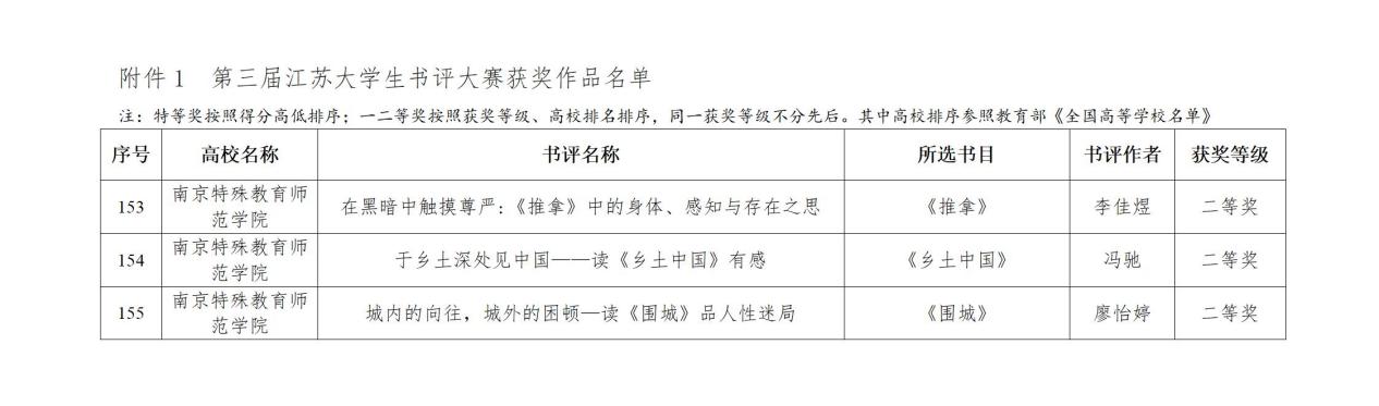 在“第三届江苏大学生书评大赛”中,我校学子凭借深刻的阅读洞见和扎实的文字功底,赢得了评委的广泛认可。李佳煜同学的作品《在黑暗中触摸尊严:〈推拿〉中的身体、感知与存在之思》、冯驰同学的作品《于乡土深处见中国——读〈乡土中国〉有感》以及廖怡婷同学的作品《城内的向往,城外的困顿—读〈围城〉品人性迷局》均荣获二等奖。这些作品选题精准、思想深刻,充分展现了我校学生深厚的人文素养和辩证的思维能力。