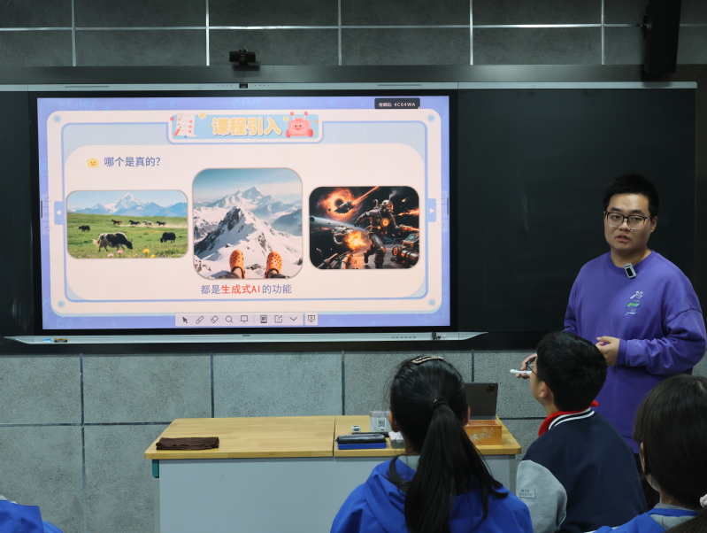 在南京市华电中学的精心安排下,同学们走进生成式AI主题课堂,观摩了“初识生成式 AI”的教学全过程。授课教师以生动通俗的语言,从生成式AI的基本概念、核心特性入手,逐步引导学生了解其在生活与学习中的应用场景。