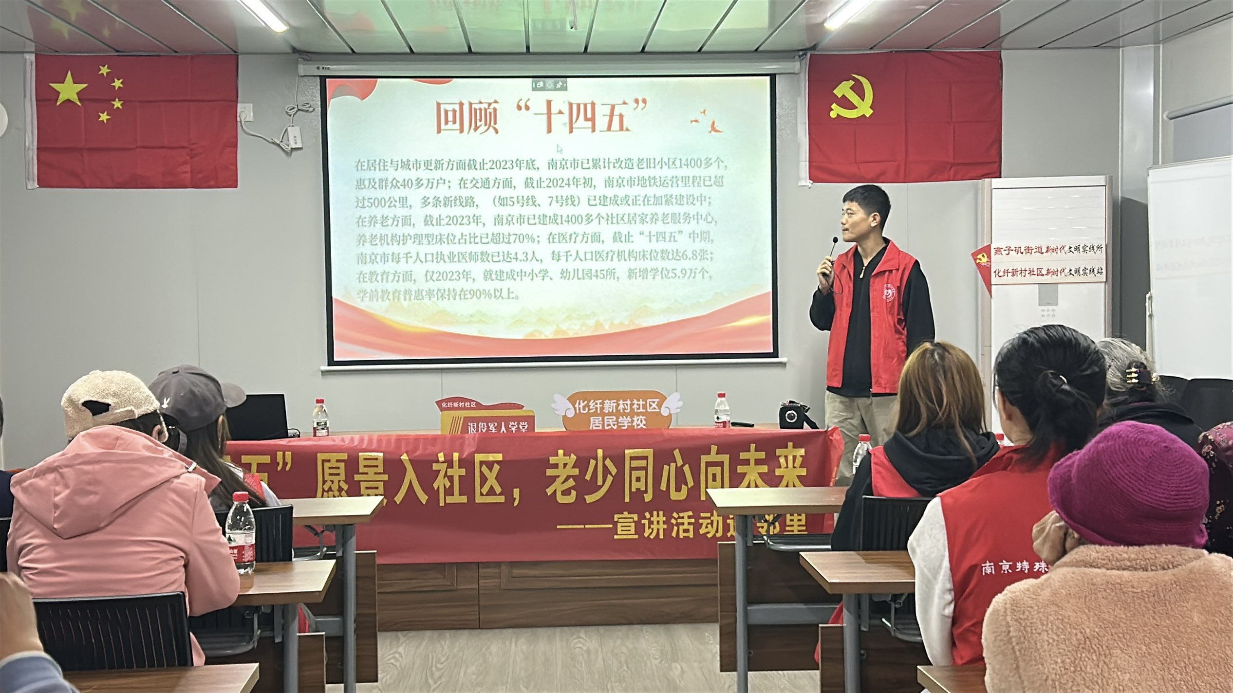 为全面学习贯彻党的二十届四中全会思想,学校“有爱无碍”红色宣讲团于2025年11月12日来到栖霞区化纤新村,面向化纤新村的老人,宣讲关于“十五五”规划的专题思政内容。此次宣讲活动得到了学校团委、马克思主义学院、特殊教育学院和化纤新村居民委员会的指导和支持。