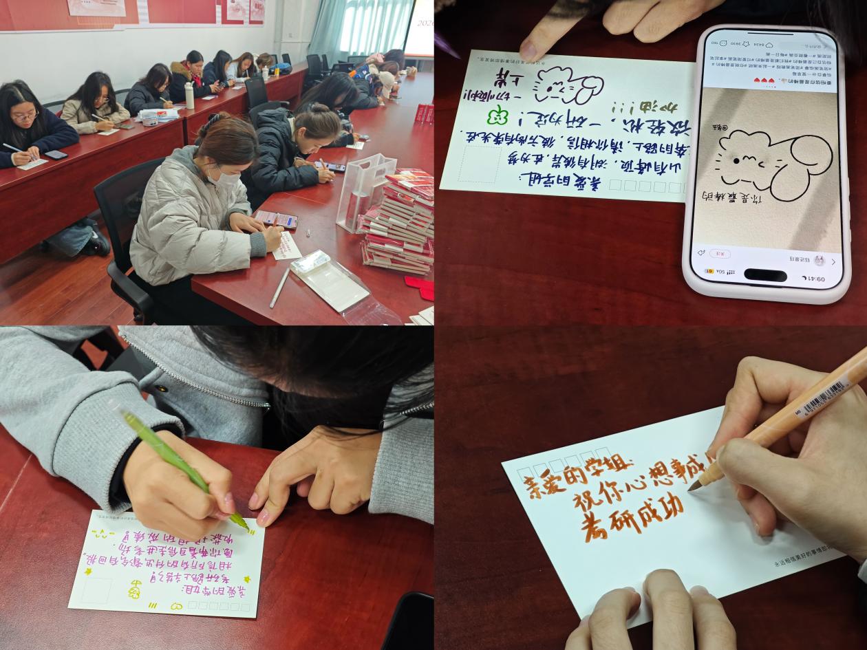 在温馨的氛围中,学院领导为考研学子们送上了精心准备的考研爱心大礼包。此外,祝福卡片上“温暖相伴,一‘研’为定”“待到雨散看天青,守得云开见月明”等一句句真挚的寄语,满载着辅导员老师和学生会学弟学妹们的深情祝福,让同学们倍感温暖。