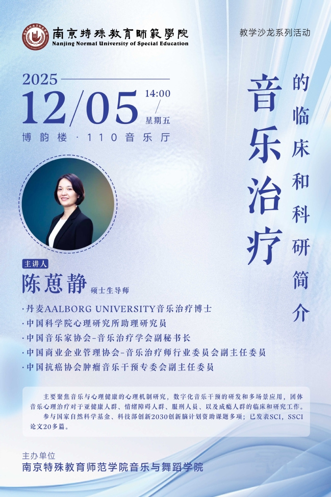 【学术预告】12月5日 陈葸静 音乐治疗的临床和科研简介