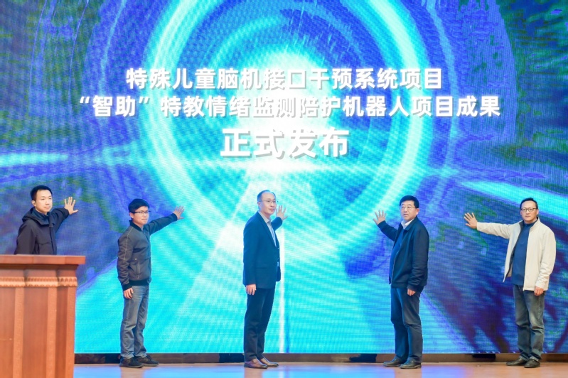 活动现场举行科研成果发布及演示,集中展现特殊教育与前沿科技融合领域的突破性成果。江苏脑机接口研究院常务副院长、江苏省人民医院主任朱伟,南京特师副校长张茂林、南京特师脑机科技研究院首席专家张杨、音乐与舞蹈学院院长张强、南京仕轩教育科技公司CTO常和森共同上台,正式发布脑机科技研究院特殊儿童脑机接口干预系统、“智助”特教情绪监测陪护机器人两大核心科研成果。